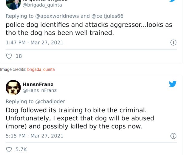 Zatímco někteří uživatelé Twitteru chválili psa za kousnutí policisty, který použil nepřiměřenou sílu 23. března, policie vyjádřila podporu obdivuhodnému způsobu, jakým služební psi pomáhali udržovat pořádek během protestů 21. března.